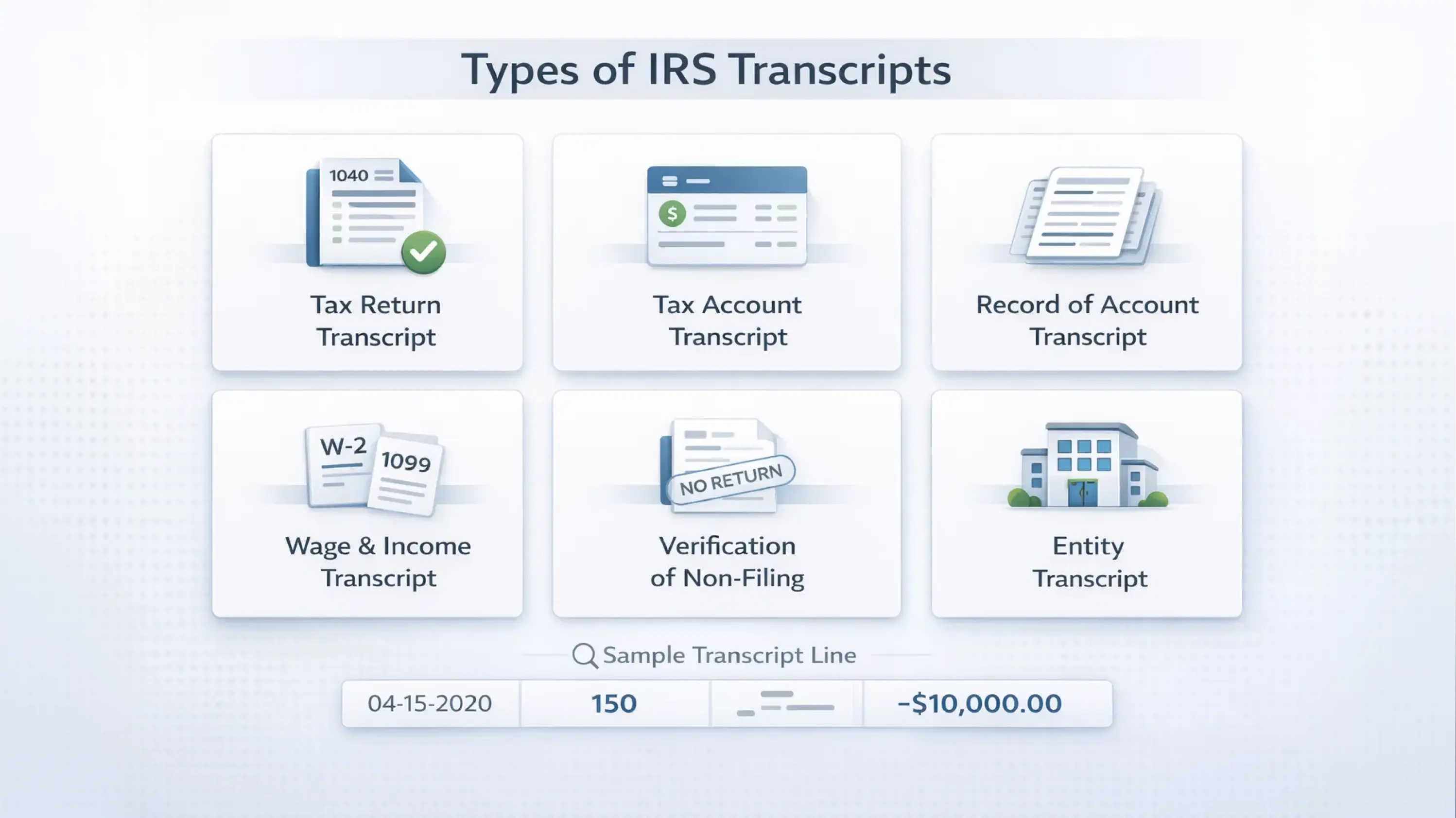 The IRS recognizes six transcript types: tax return, tax account, wage and income, record of account, verification of non-filing and entity transcripts. Each serves a different purpose, from summarizing the original return to listing third-party income reports or confirming that no return was filed.