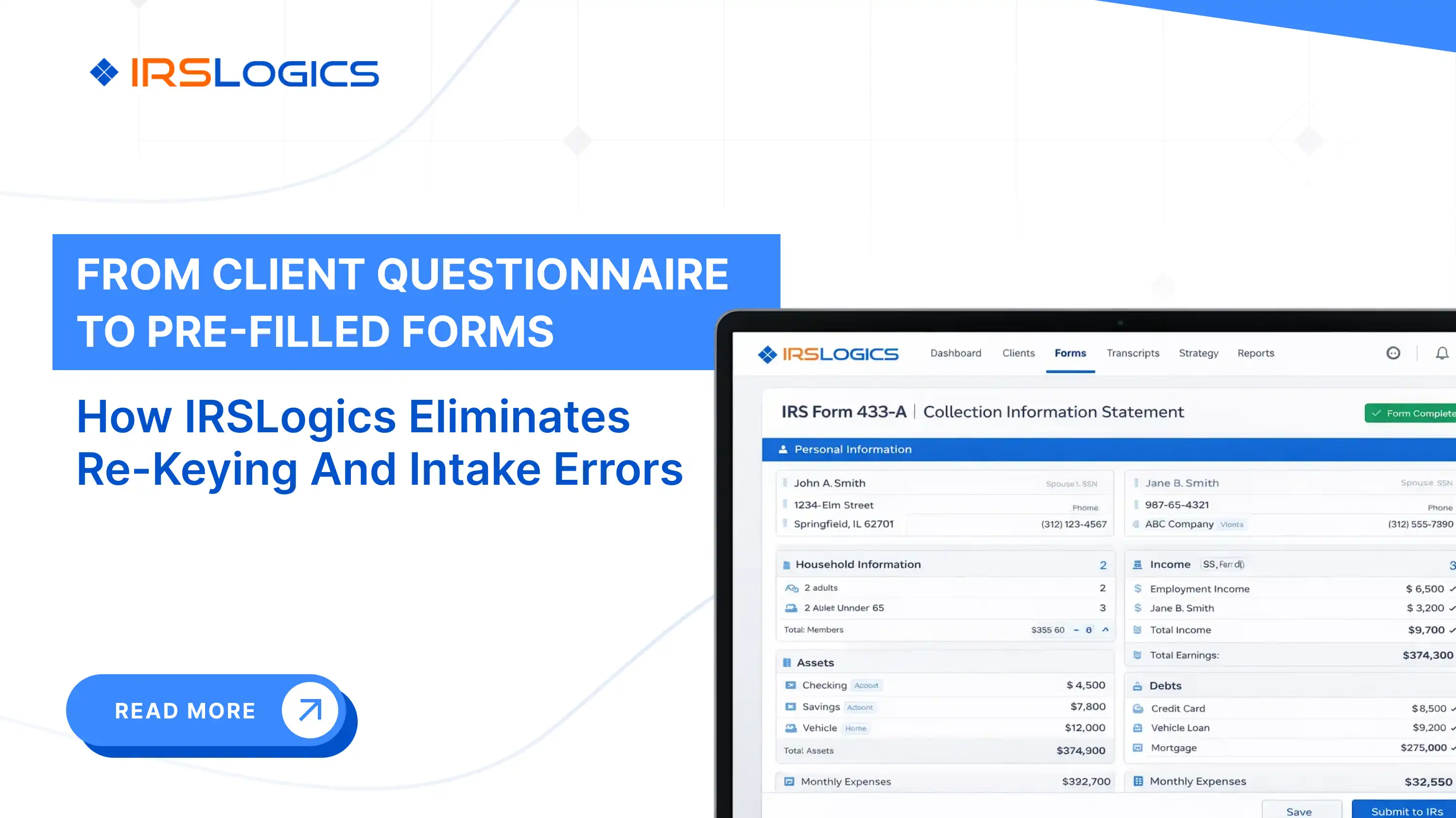 See how IRSLogics turns client questionnaires into pre-filled IRS forms, reducing re-keying, intake errors, and case delays for tax resolution teams.