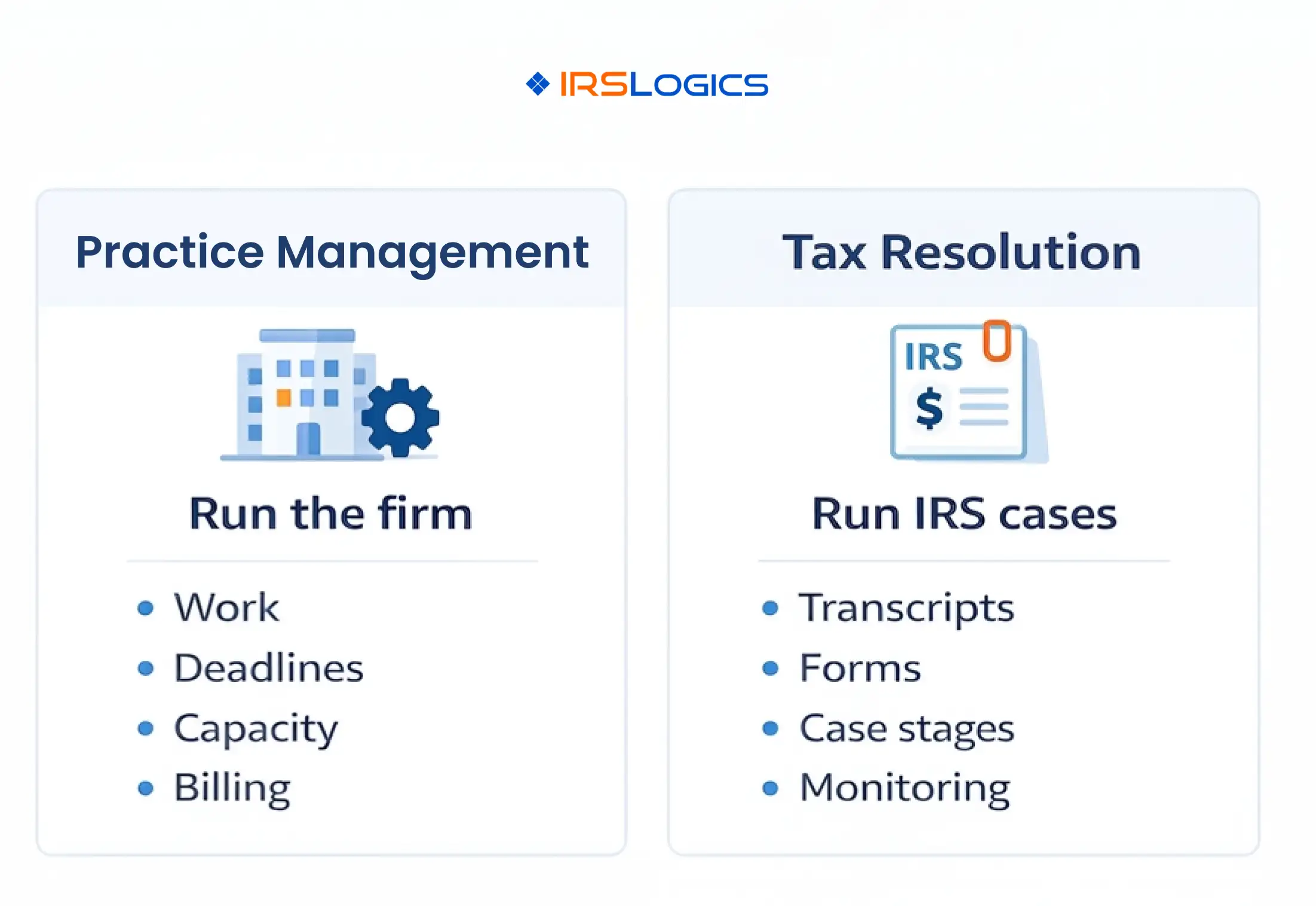 For example, IRSLogics positions its tax resolution software around case management, workflow automation, IRS transcript pulls, client portal updates, billing, and exportable reporting, all tied to resolution work.