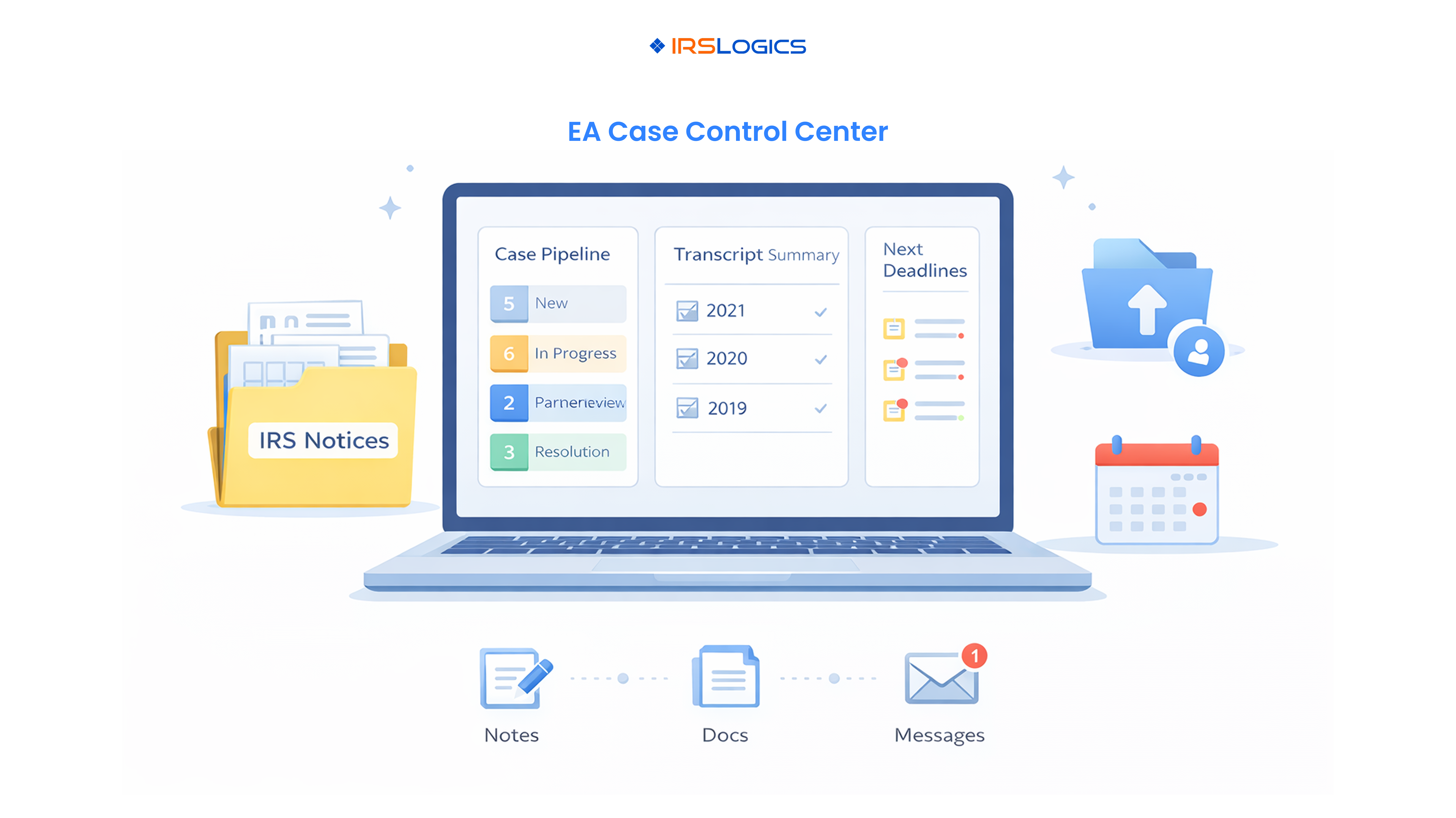 Modern platforms, including IRSLogics, IRS Solutions, and Canopy, highlight secure client portals as a core feature: document exchange, status visibility, and messaging in one place.