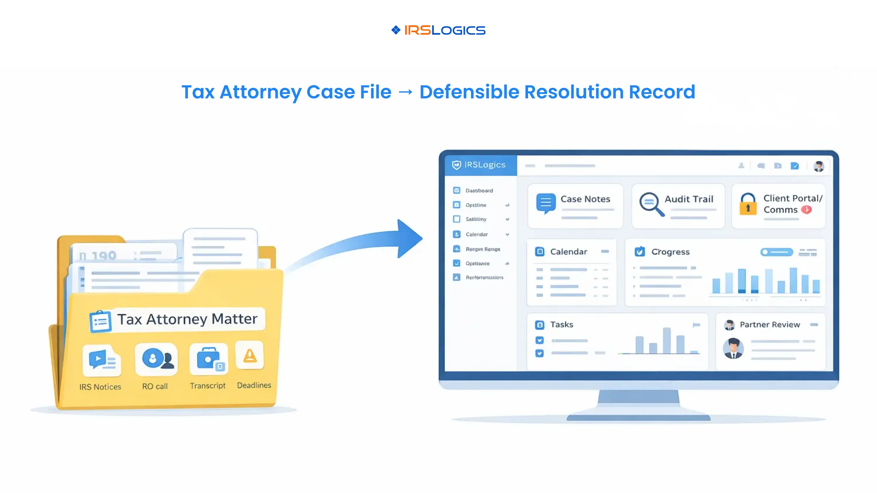 IRSLogics is positioned as a complete tax resolution CRM and case management system created exclusively for tax resolution professionals, including attorneys, CPAs, enrolled agents, and tax resolution firms.