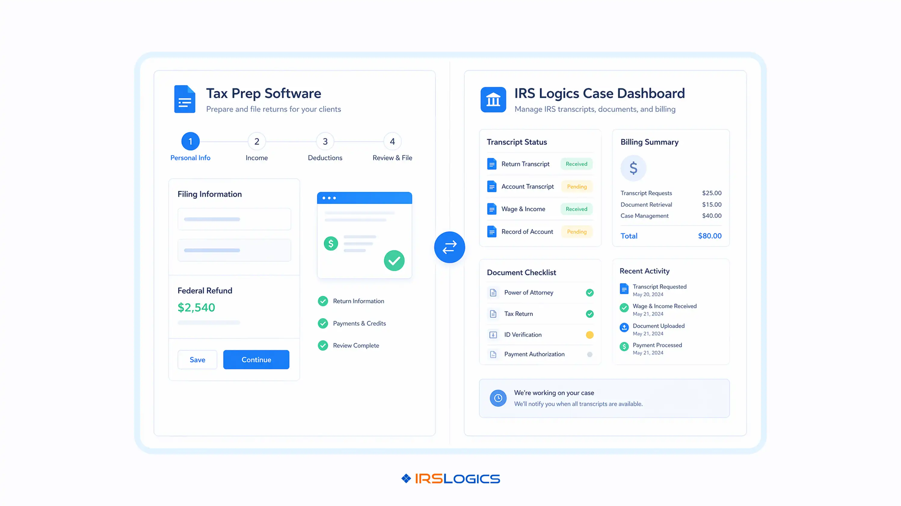 How does IRS Logics work alongside existing tax prep software? It manages the resolution side like intake, documents, transcripts, workflows, and billing. Your tax prep software handles filing, and both tools work together without overlap.