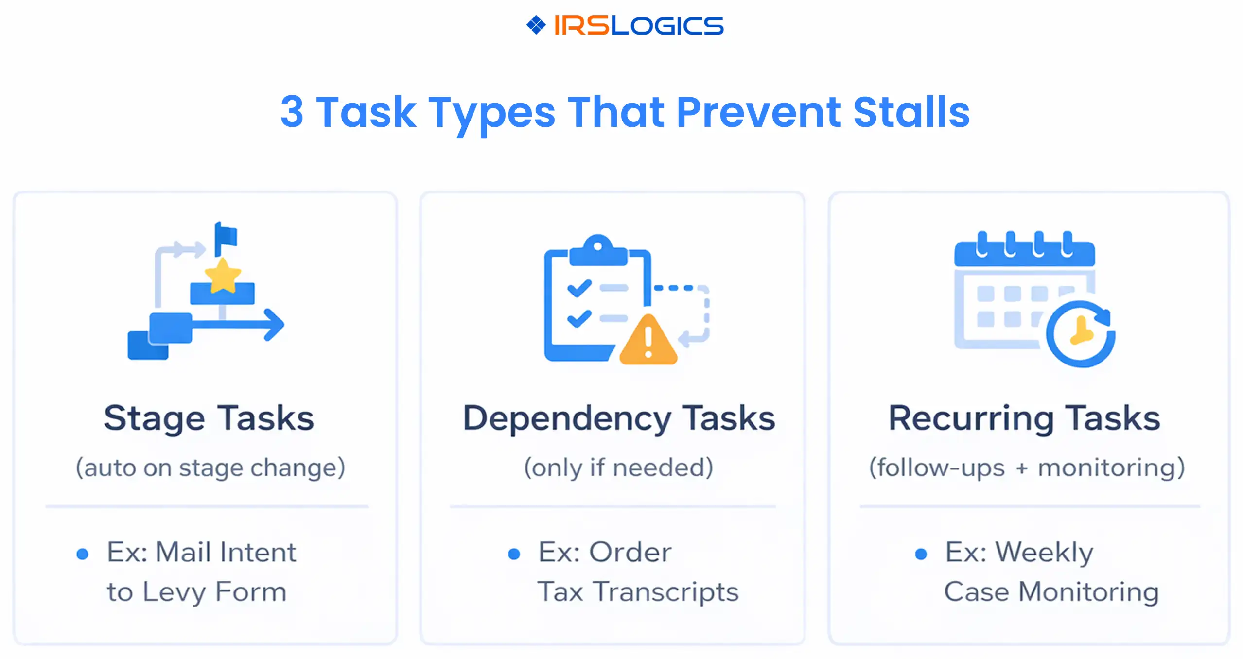 These trigger only if a condition is true. Example: if there are unfiled returns, your system creates a “Compliance Cleanup” task set and blocks moving into “Resolution Path And Plan” until completed.
