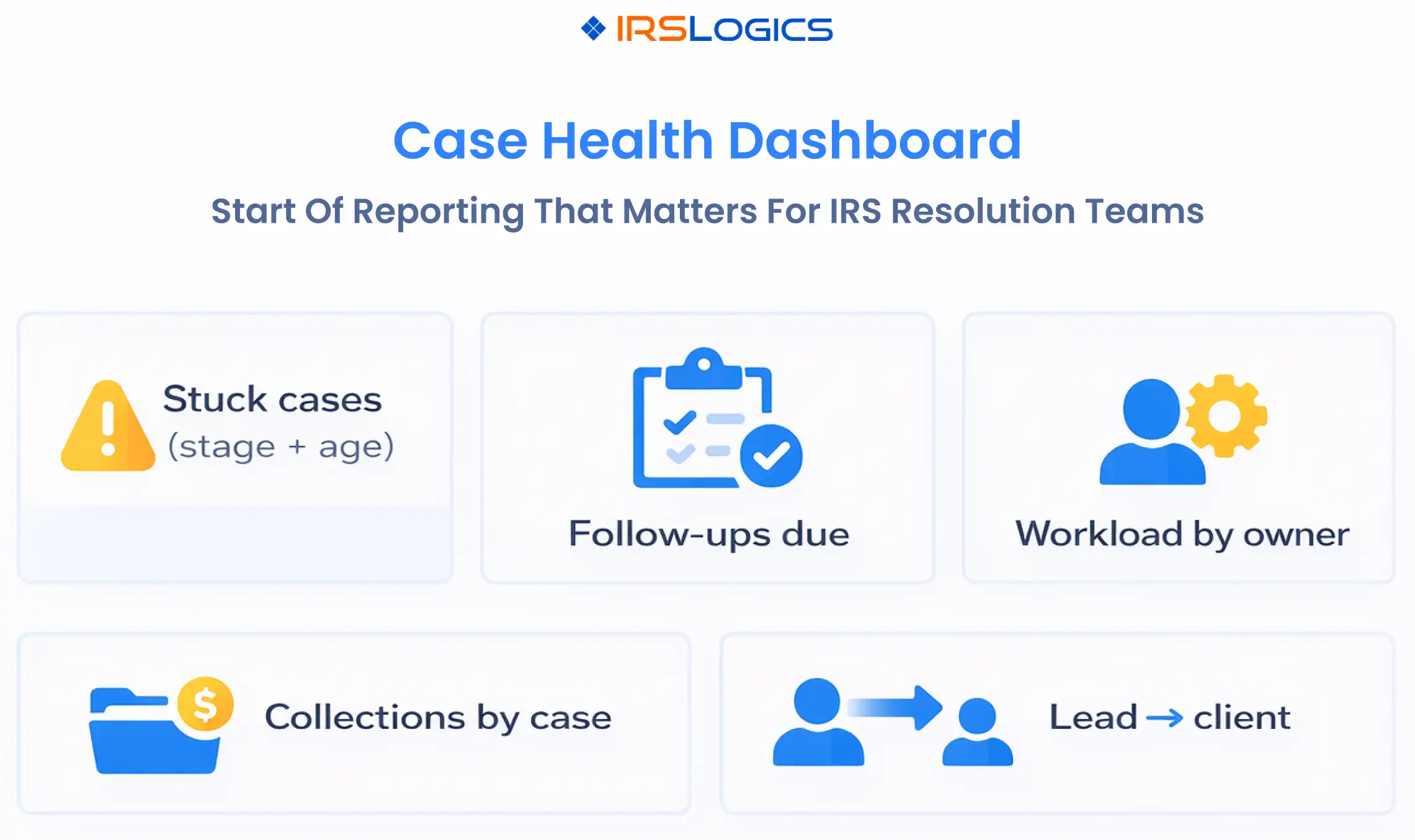 IRSLogics positions reporting around real-time dashboards, audit trails, and exportable reports to track performance, which aligns with what tax resolution leaders need for operational control.