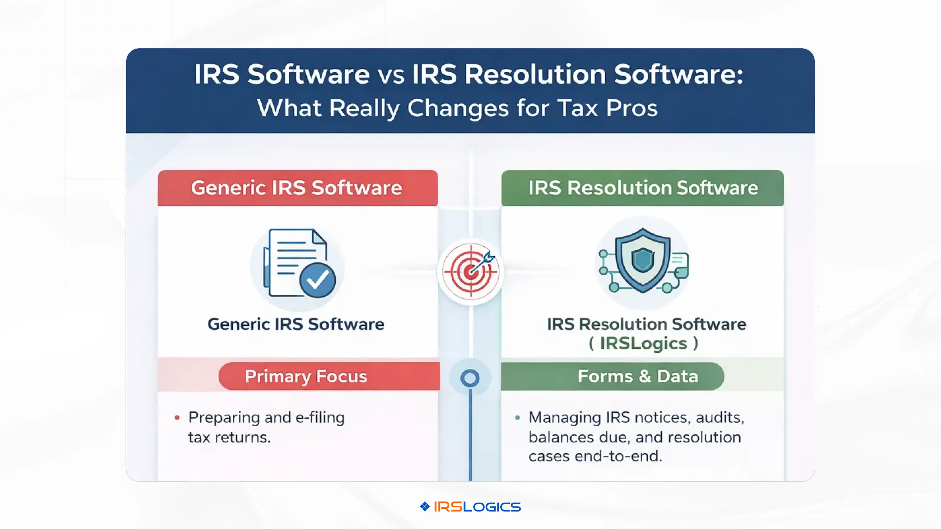 IRS software usually refers to tax preparation and e-file tools that help professionals prepare and file returns. IRS resolution software is focused on what happens after filing: notices, audits, balances due, offers in compromise, appeals and collections. It adds IRS case management, specialized workflows, integrated forms, billing and analytics.