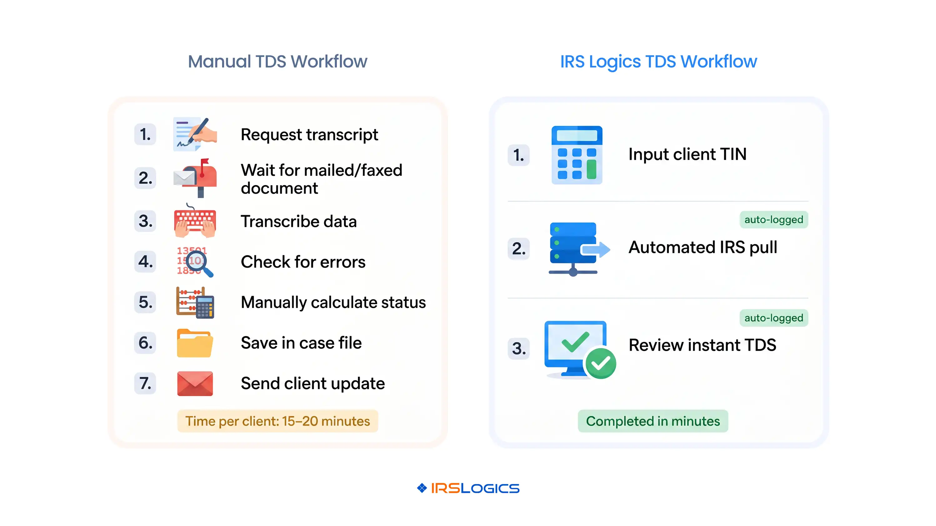 This is the difference between a tool that connects you to TDS and a platform that integrates TDS into a complete resolution workflow. For a direct comparison of how that distinction plays out in practice, the IRS Logics accounting practice management software vs. tax resolution software breakdown details it.