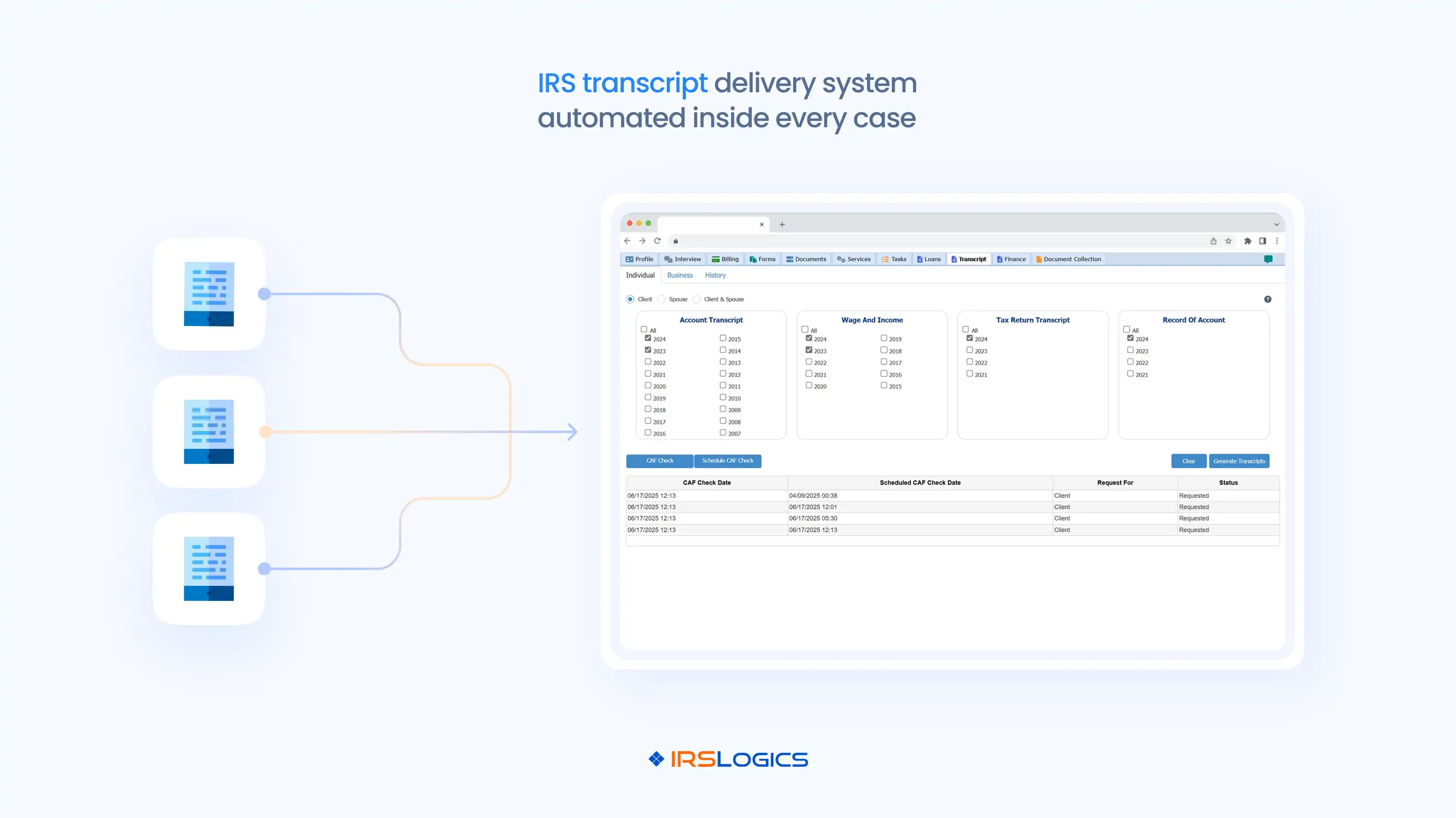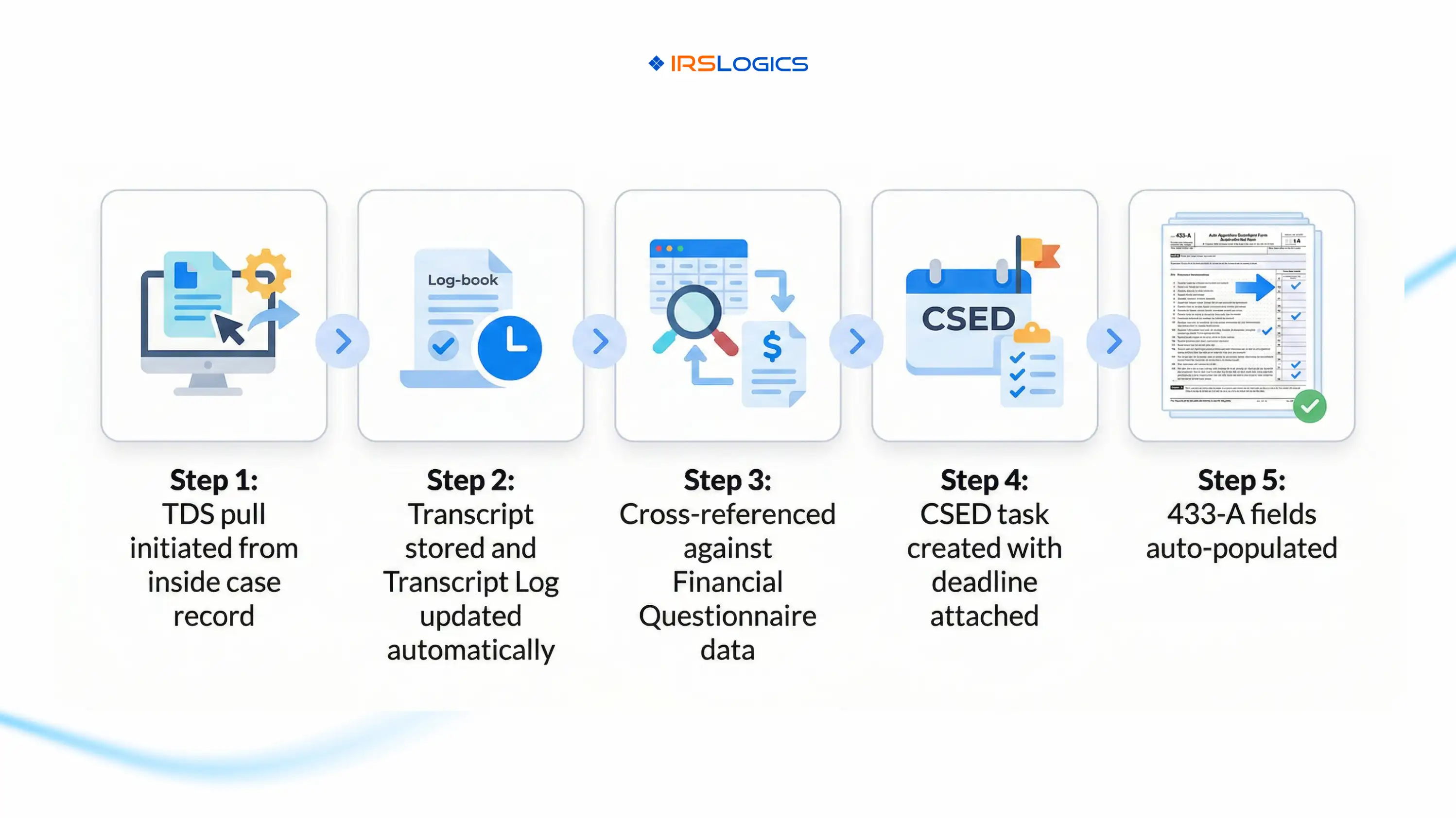 IRS Logics connects to the IRS Transcript Delivery System directly inside every client case record. You do not leave the platform. You do not download a file. You do not re-upload it somewhere else.