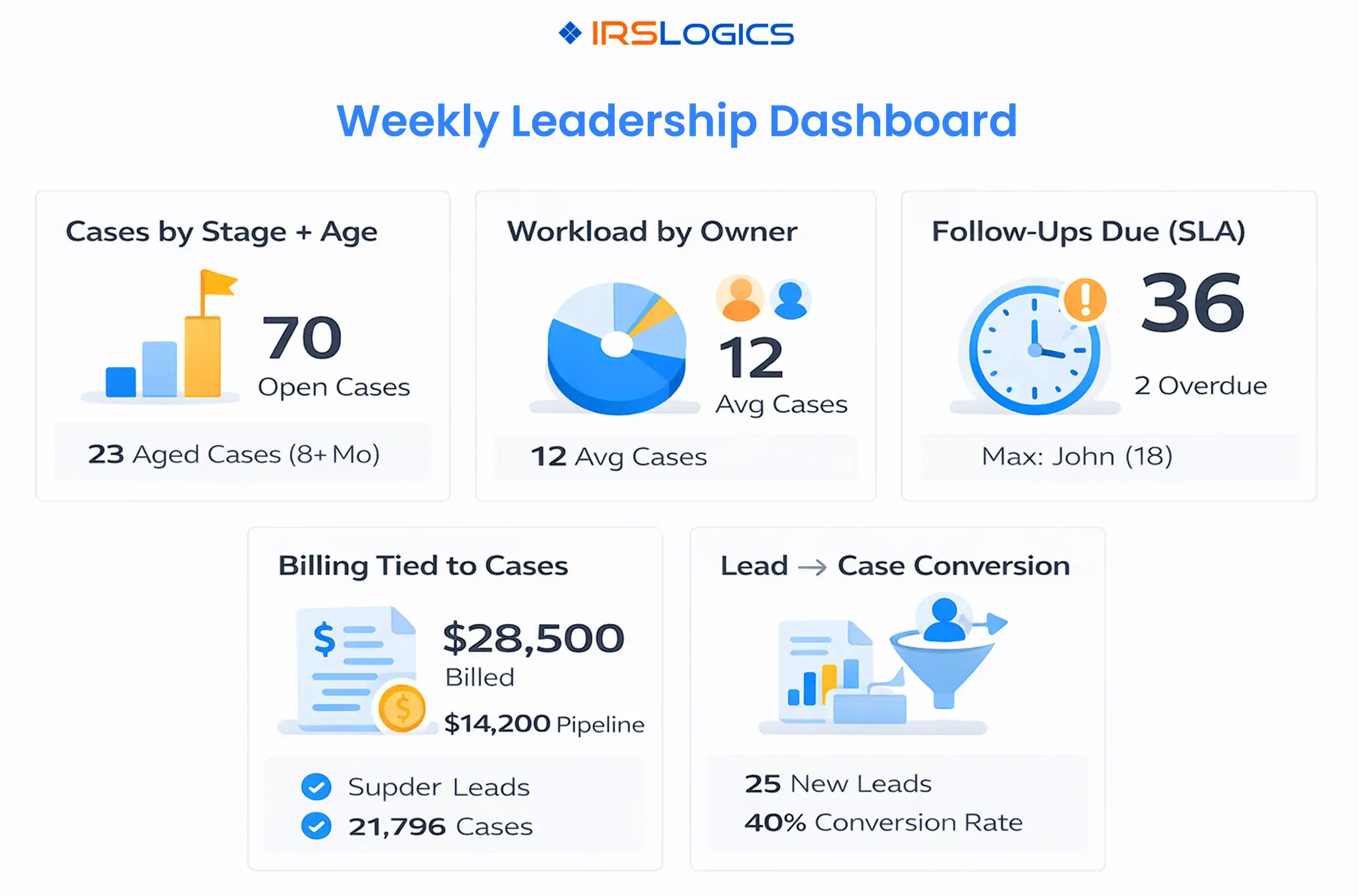 This is the bridge between growth and delivery. IRSLogics also positions itself as a CRM that tracks leads and conversion reporting.